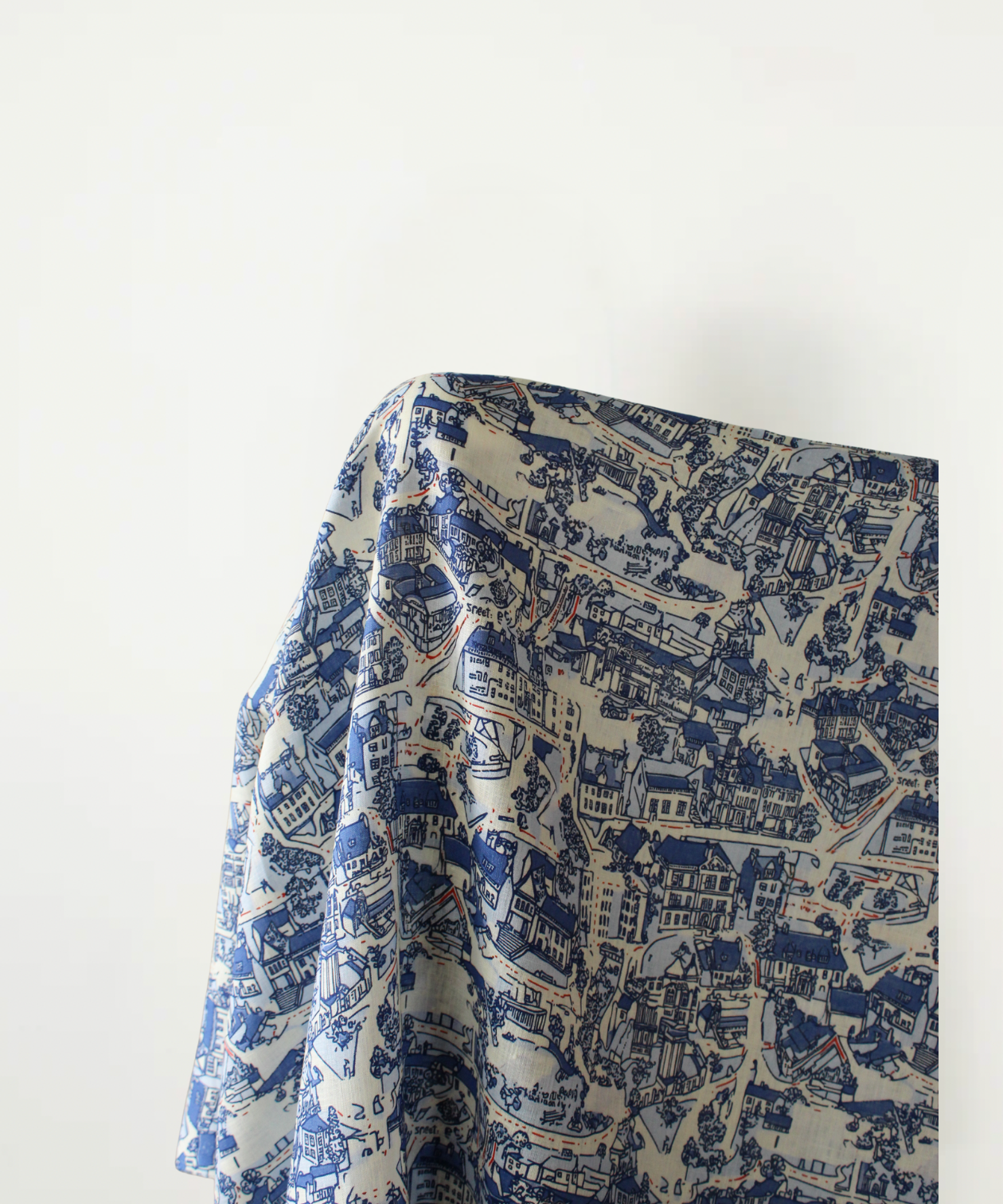 Summer Love: 100% Linen, Blue & White Villages Print 140 cm w, 145 gsm $40