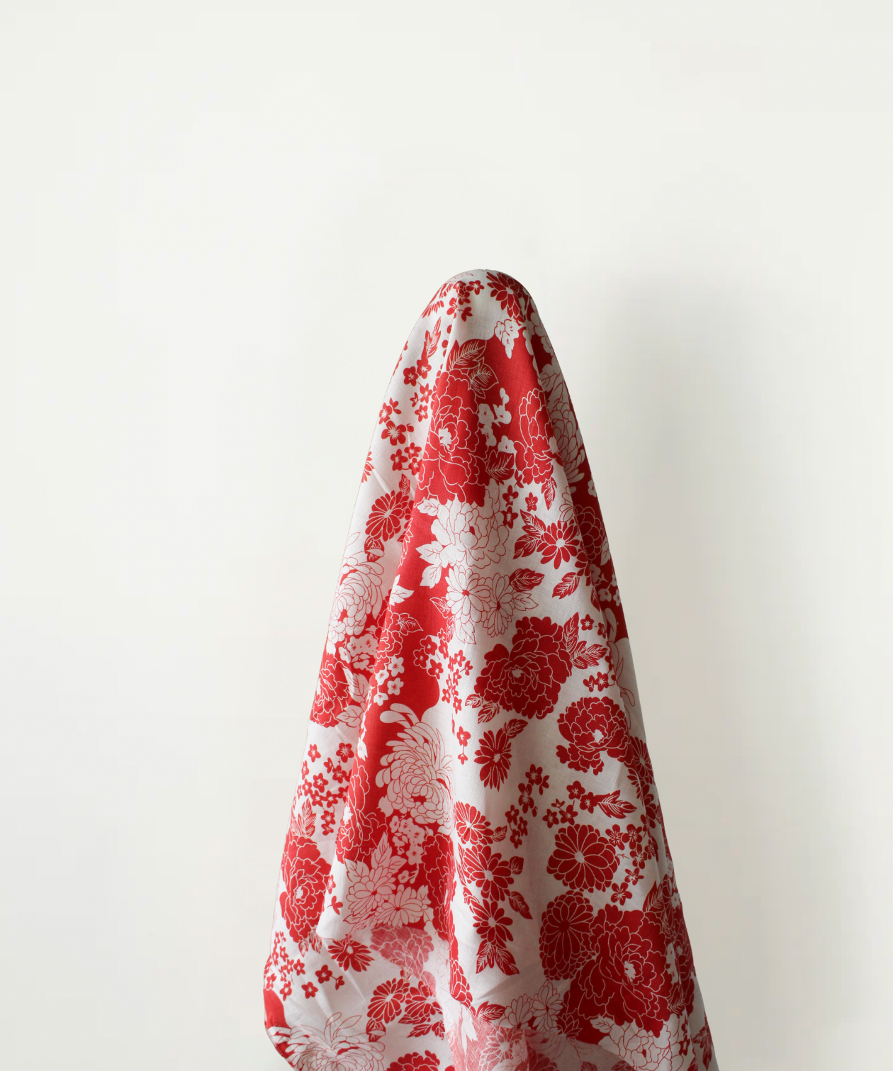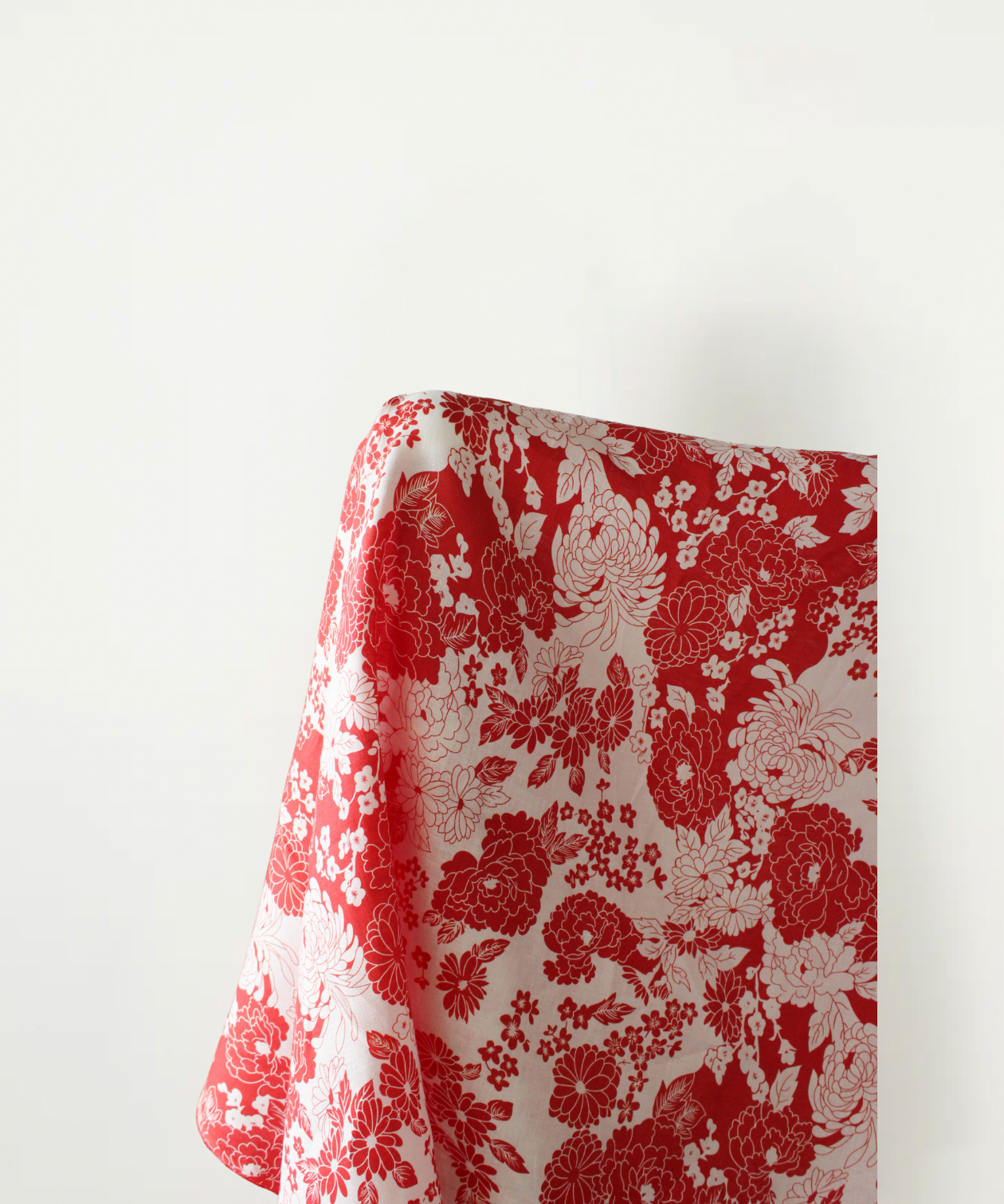 Summer Love: 100% Linen, Red & White Chrysanthemum Print 140 cm w, 145 gsm $40