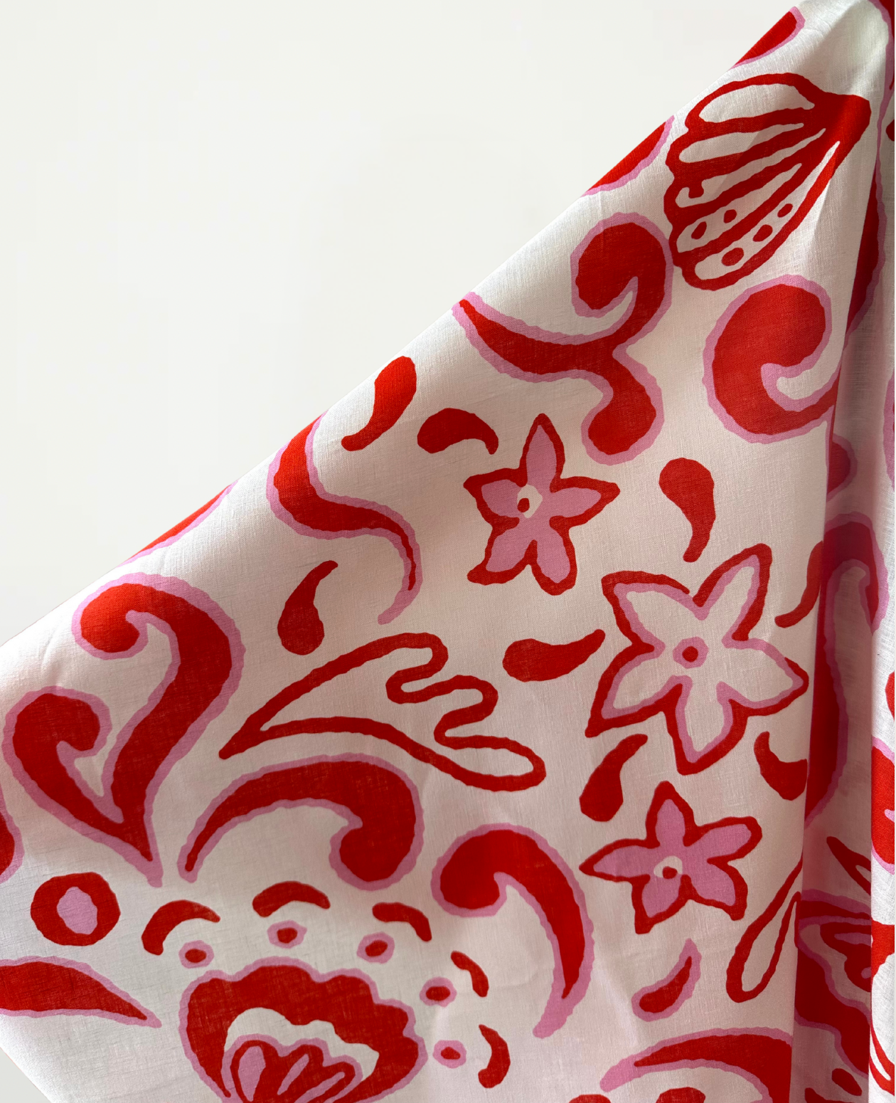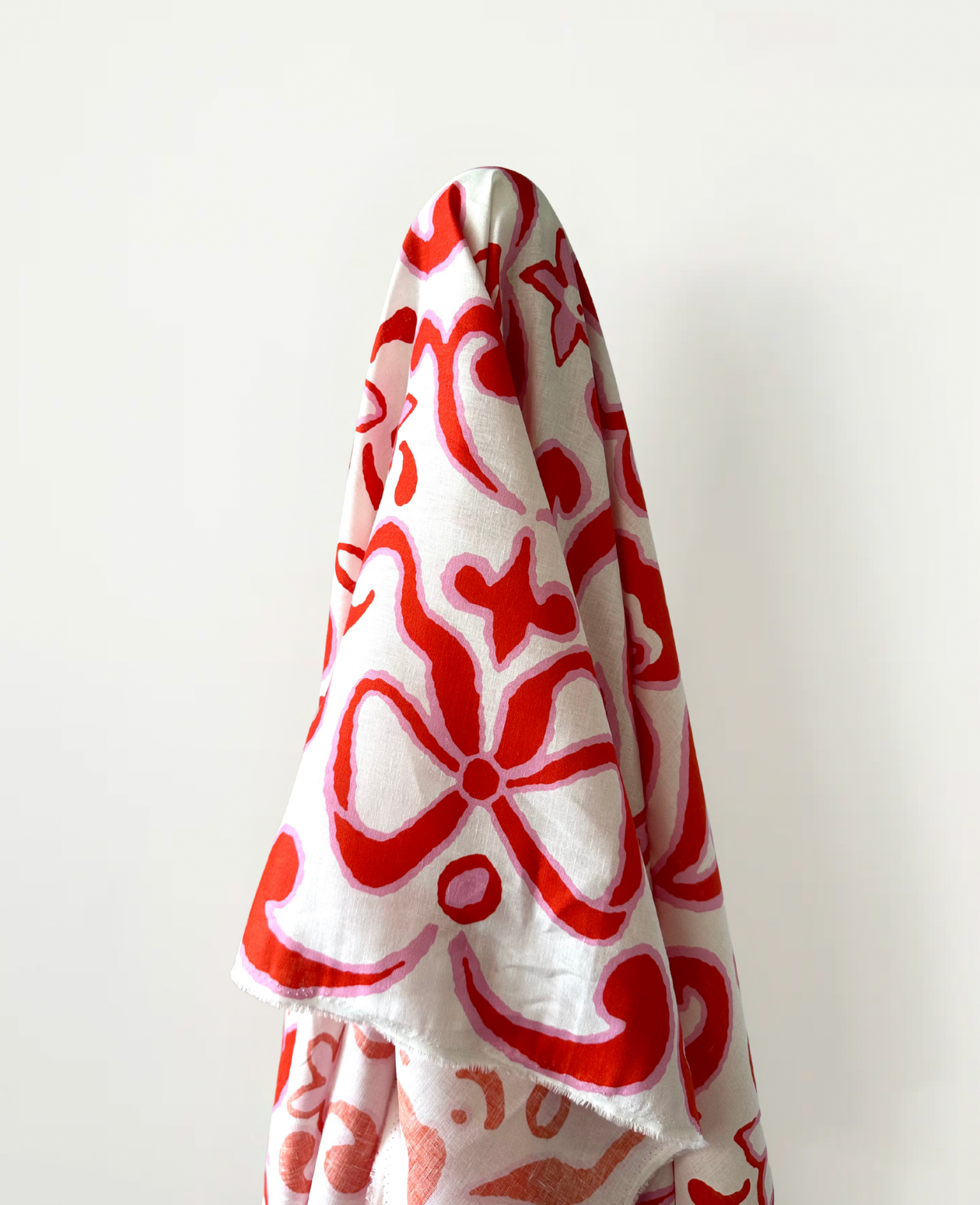 Feeling like some colour - check out this 100% linen print in a vibrant red, pink and white print. Versatile and stylish, this fabric is perfect for a variety of garments including skirts, shirt dresses, and palazzo pants.