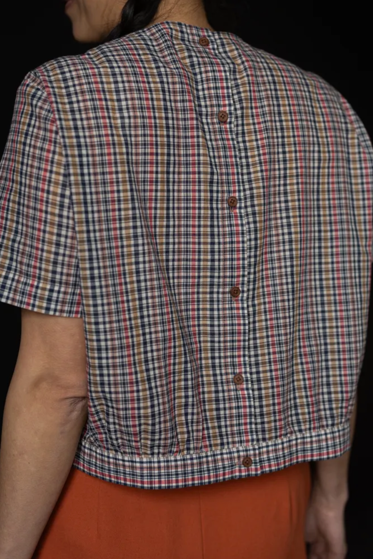A feminine blouse with back buttons and gentle gathers into a waistband.