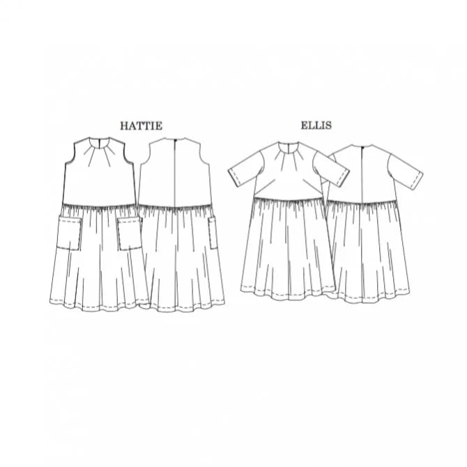 A perfect combination for any mood, if Ellis is a gentle woman then Hattie is a blithe bachelorette. Both feature four delicate neck darts, Ellis, who gets some more feminine shaping from bust darts, is waisted, with set in sleeves and inseam side pockets. Hattie has a lined bodice, dropped waist and bold patch pockets.