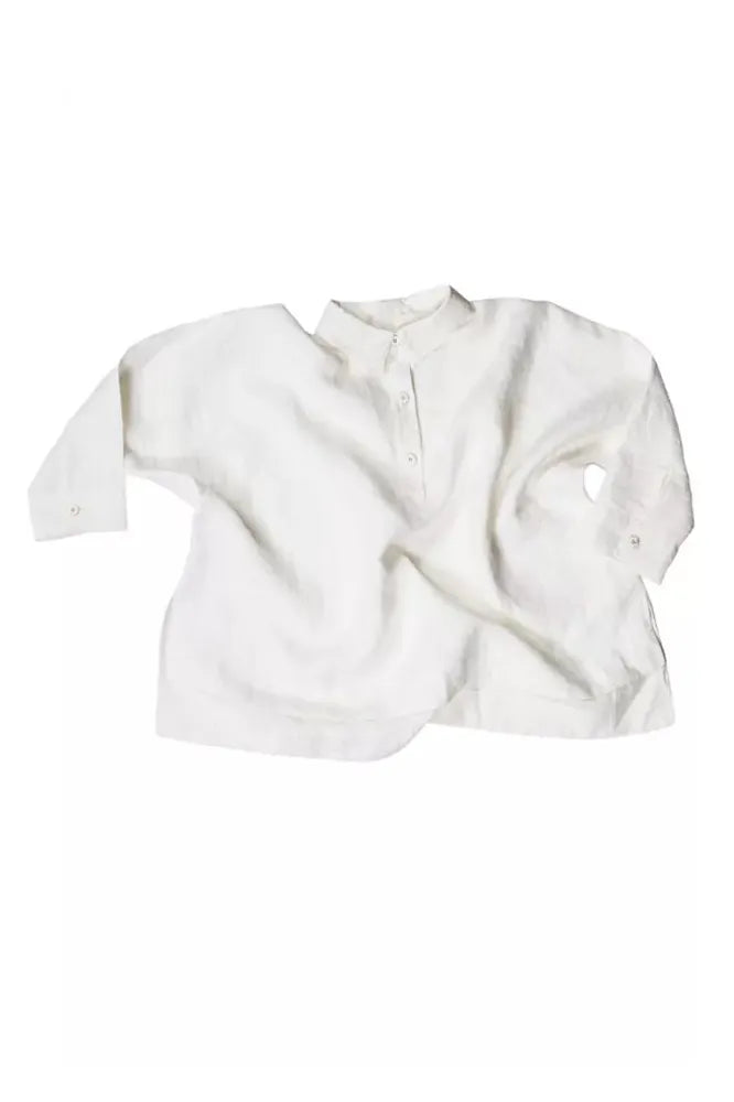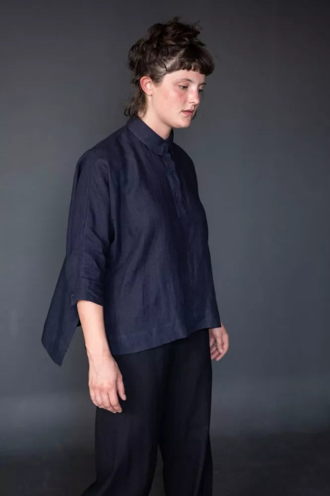 An oversized, boxy shirt with a dropped back hem and half placket. Swingy and absurdly comfortable.
