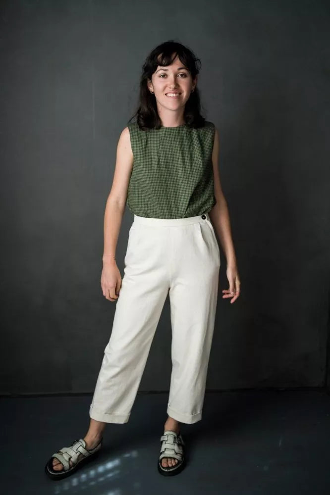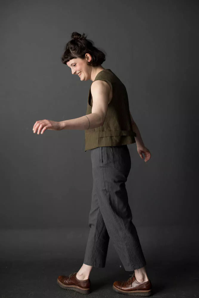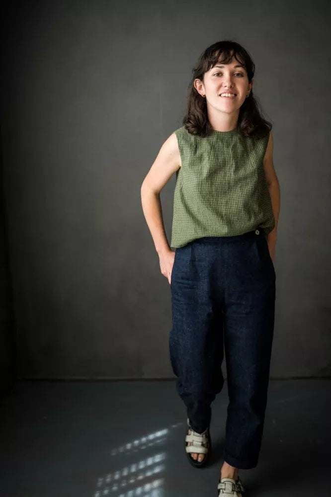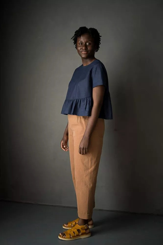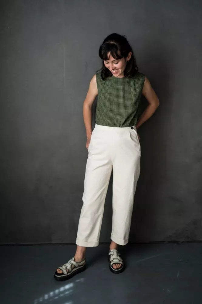 The Eve Trouser is cropped, with a slightly tapered leg and optional turn ups. It's an easy garment to make, fitting neatly at the waist and over the hips with a simple side zip and two back pockets. Choose to make pleats or darts into the waist seam.