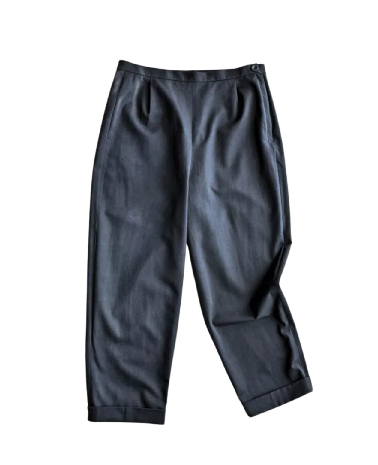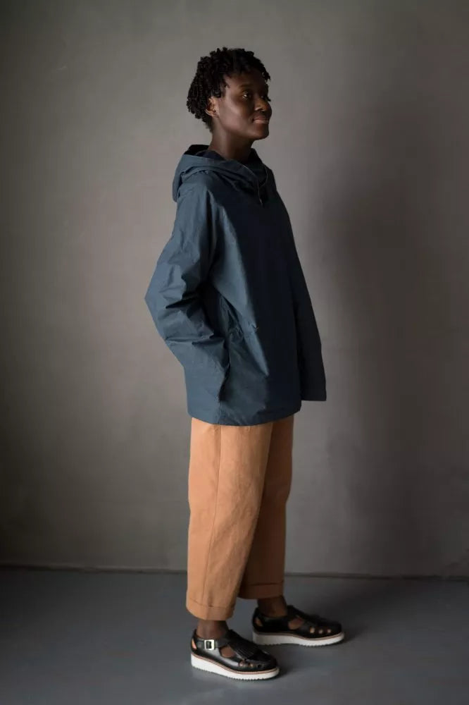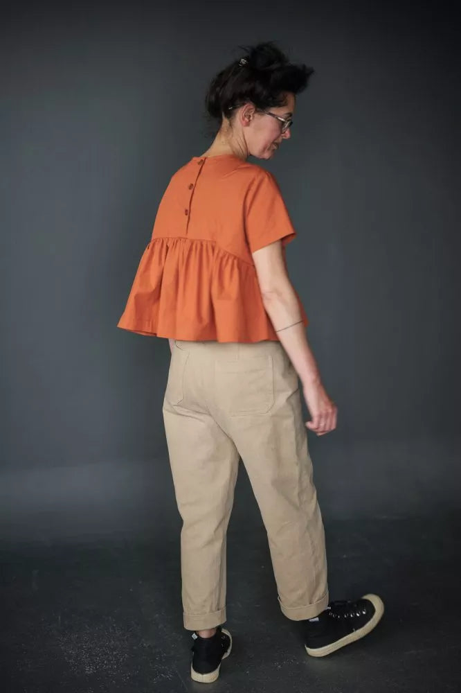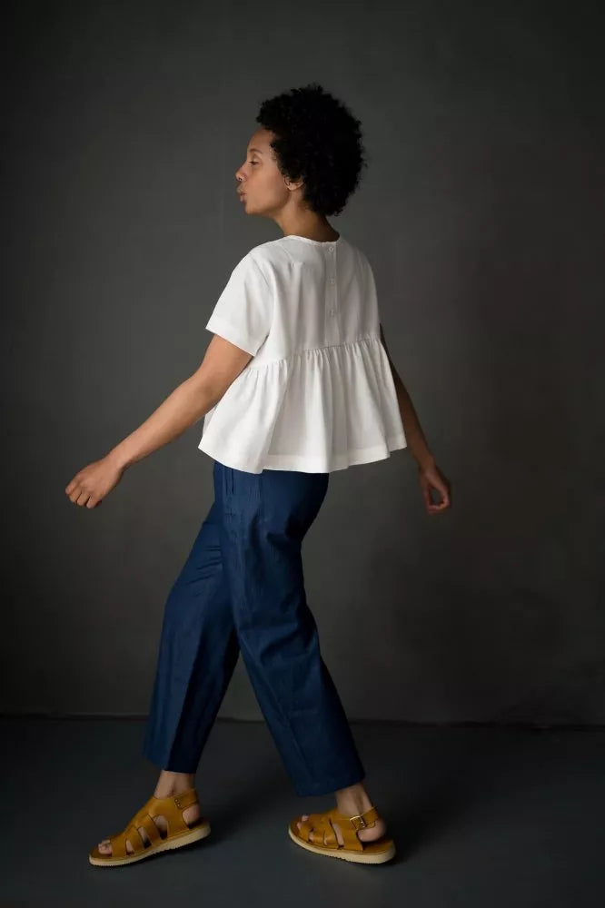 The Eve Trouser is cropped, with a slightly tapered leg and optional turn ups. It's an easy garment to make, fitting neatly at the waist and over the hips with a simple side zip and two back pockets. Choose to make pleats or darts into the waist seam.