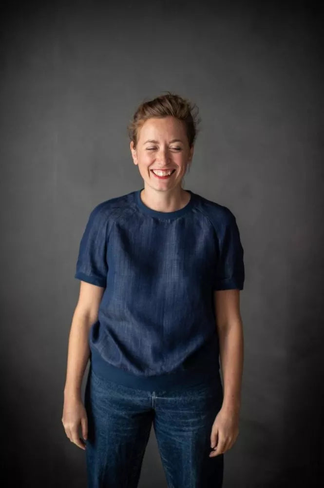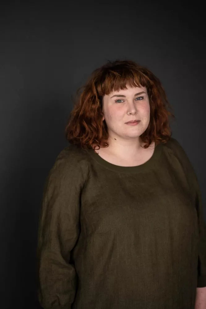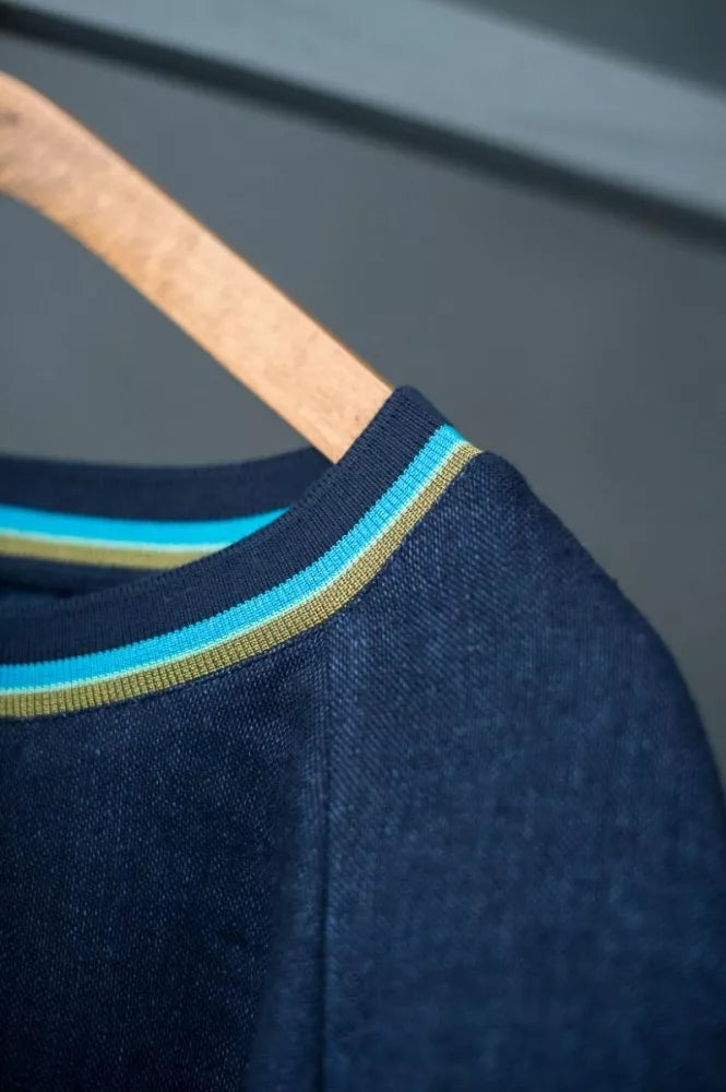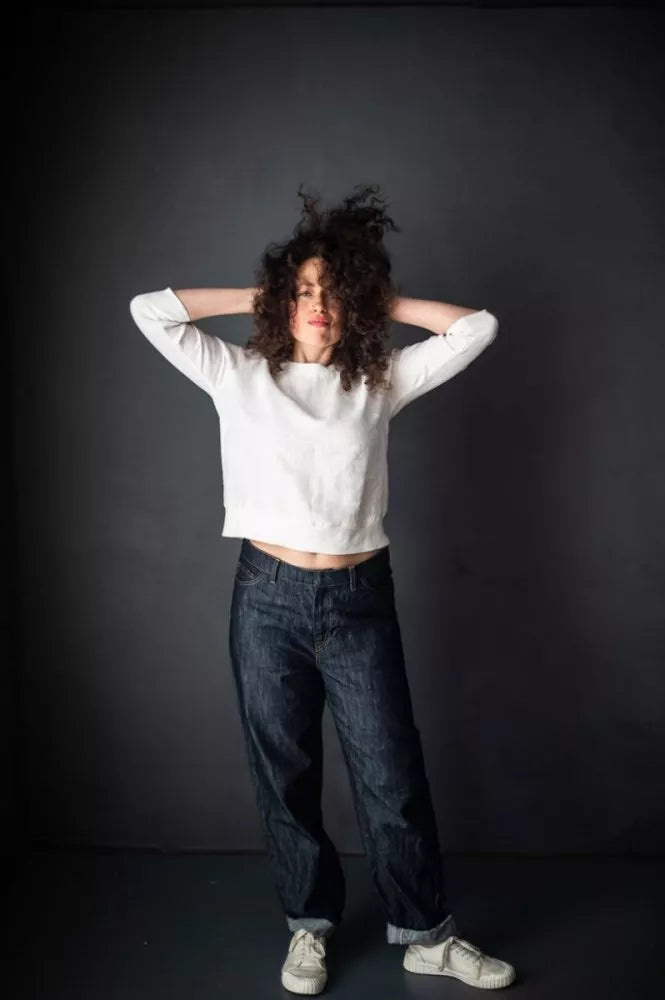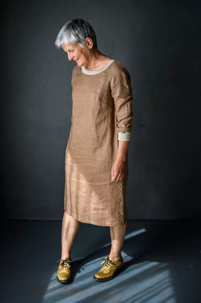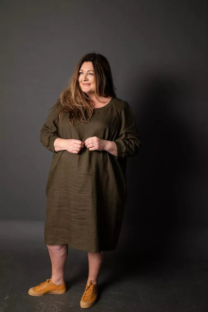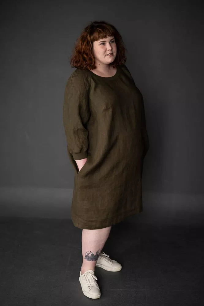 The Fielder (top or dress) is based on a traditional sweatshirt with ribbed neck, sleeves and hem (tops only). It features three quarter length raglan sleeves and inseam side pockets (dress only).