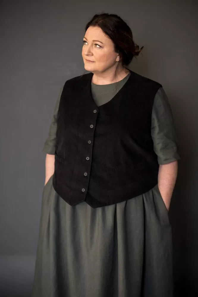 A softly structured waistcoat with a boxy fit, two welt pockets and a simple stitched belt at the back. Layer up in the winter or wear on its own in the summer in a tumbled linen.