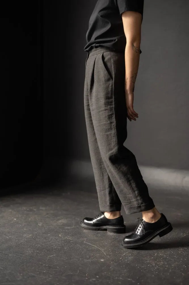 Fabric suggestions - The Pegs are ideally suited to a mid-heavyweight cotton canvas, 8oz organic sanded twill, corduroy, light-medium weight woollens and 7-10oz denim. Lighter weight cloths like linen and tencel-linen will give you a softer silhouette.