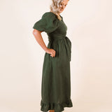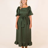 Featuring beautiful puff sleeves, a frill hem, an elasticated waist section and of course, pockets! The perfect occasion gown with no end of compliments coming your way.