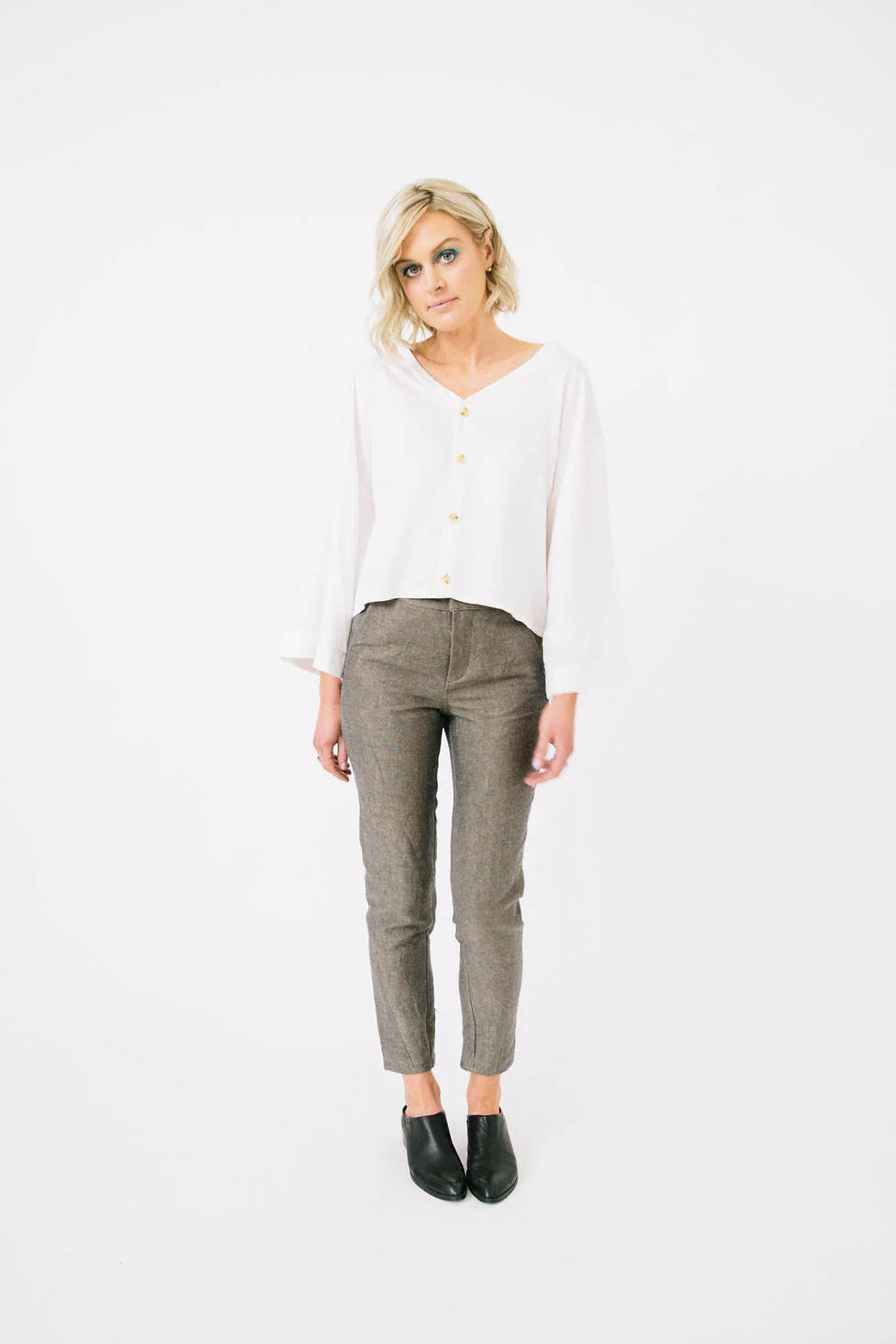 A versatile long sleeve blouse for any occasion. The button up V-neck can be worn to the front or the back. Choose between a shirt tail hemline or a cropped straight hem, and select your favourite sleeve option – a wide airy shape, or a cuffed and gathered sleeve with a button fastening. Whichever your preferred style, the Nexus will be your go-to blouse all year round.
