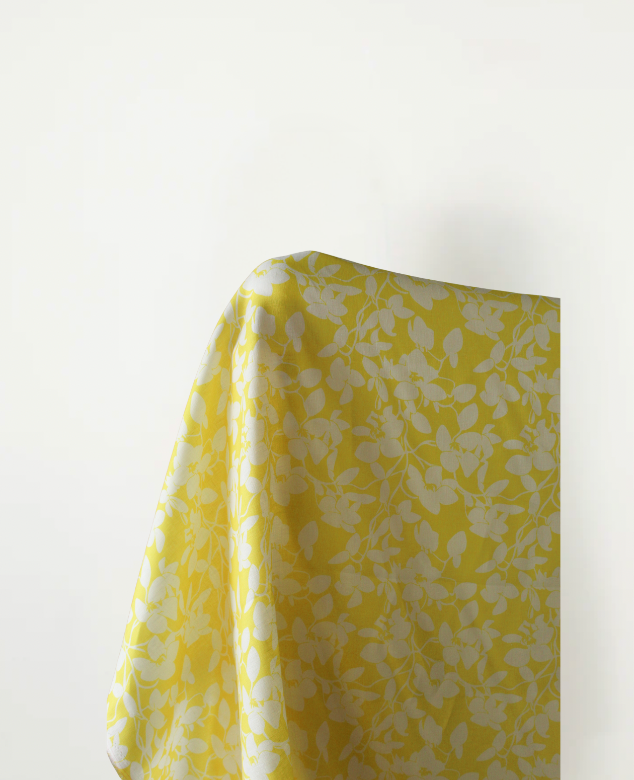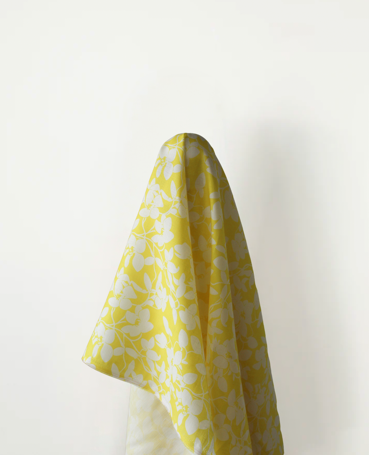 Summer Love: 100% Linen, Lemon & White Singapore Orchid Print 140 cm w, 145 gsm $40