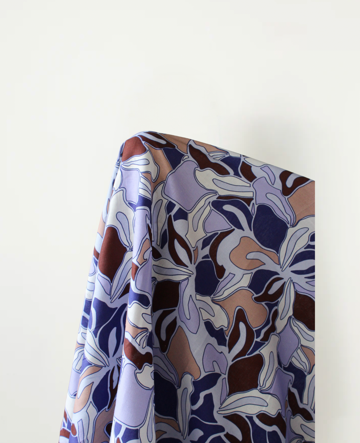 Summer Love: 100% Linen, Lilac & Brown Abstract Flower Print 140 cm w, 145 gsm $40